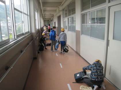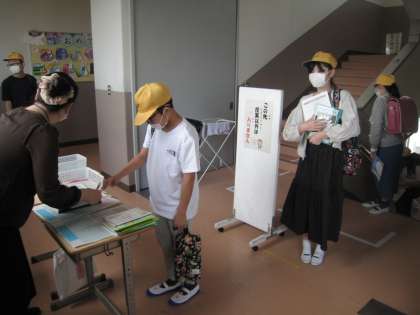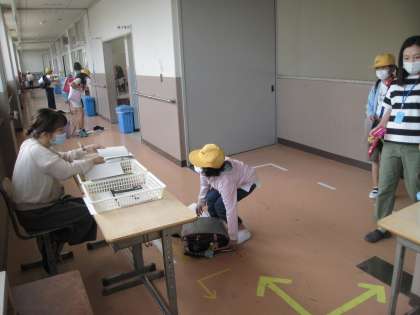きちんと間隔をとって並んでいます。初日の登校日だけは連絡帳に書いてある体温をチェックします。記載がない場合は、その場で体温を計りますが、まだ非接触タイプの計測器は学校にないので、10分ほどかかる体温計を使います。みんな「うへぇー」という顔になりますが、仕方ありません。次からは忘れずに家で計って登校しましょうね♪