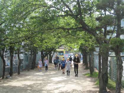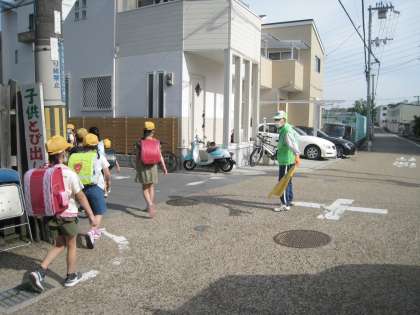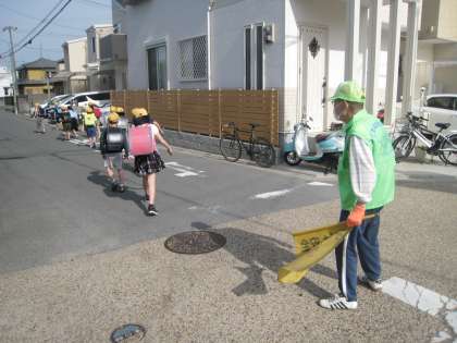 今日から2回目となる分散登校、朝の様子です。学校前の信号から1つ山側の四辻は、大きなトラックやゴミ収集車、通勤などの車の往来がかなりあり、危険な所です。今日は見守り隊の方が立ってくださっています。