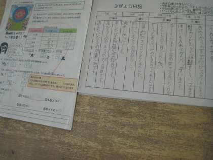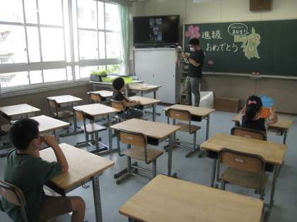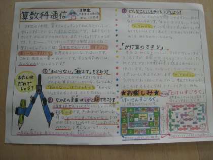 このクラスは、子どもたちの自己紹介ビデオメッセージを見る所です。プリントをおいてある棚には、楽しそうな「算数科通信」がありました。3年生では3行日記も取組みます。