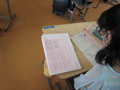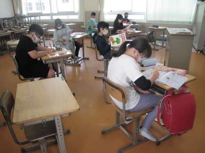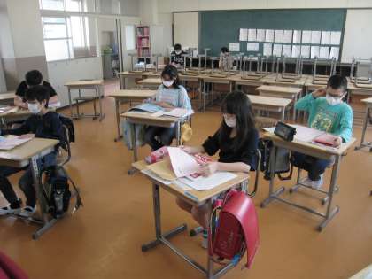 6年生、それぞれ一心に取り組んでいます。学習・生活予定表をチェックするなど、それぞれのペースです。教室後方へ一方通行の通路がつくられており、順に1人づつ行き、先生が「何か困ったことはないか」と言葉をかけています。学習面、生活面、精神面でのフォローとケアをしています。