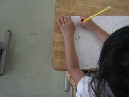 1年生のこの教室では、グルグル描きのプリントに取り組みます。まず色鉛筆の好きな色を選んで、・・・。子どもたちの色彩感覚は美しく豊かです。あとは手を柔らかく動かすのに楽しく慣れたらいいですね♪