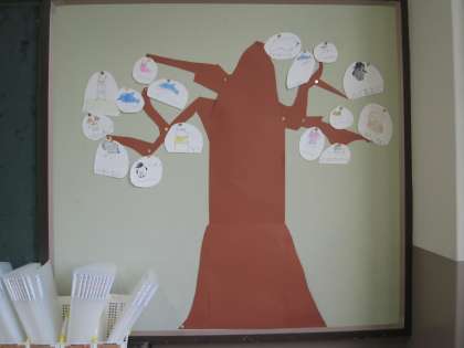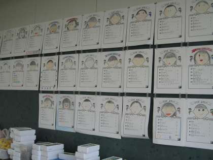 分散登校が続いており、クラス全員と出会っていませんが、「みんなでつくる木」には好きな動物と自分の名前を書いた葉っぱが、少しづつ枝に葉を広げて、まだ見ぬお友だちとつなげます。自己紹介カードの掲示も増えつつあり、「こんな子がいる」と輪をひろげます。