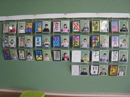 4年生のテレビのEテレを活用した学習プリントです。視覚的に学べて楽しい工夫です。子どもたちとつなぐ工夫、名前をデザイン化した作品を写真の横につけてお友達の紹介です。後でつないで大きな作品となるそうです。