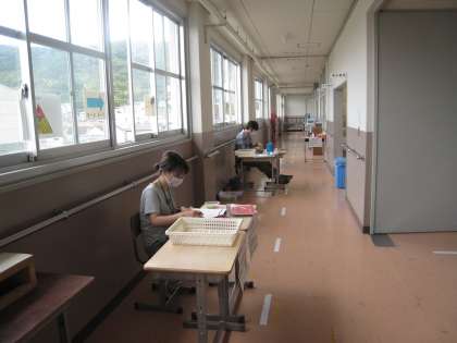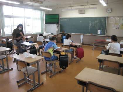 5年生の教室、ここでも漢字のお直しをしています。廊下では、5年担当の先生たちが、提出物や家庭学習の課題をチェックしています。子どもたちの学校滞在時間が短く、担任の先生たちは学級につきっきりになるので、すべての教員がどこかの教室や廊下でこのチェックを行っています。