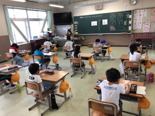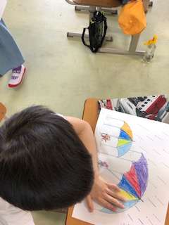 1年生の教室、静かでとても落ち着きます。雨降りの絵に色を塗っています。きれいな色の取り合わせです。