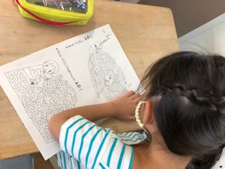同じく3年の教室です。迷路がいろいろ出ています。難しいのもありますが、抜けることができるかな♪