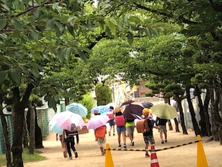 ポツポツ落ちてきた雨が止まったようでしたが、やはり途中から降ってきました。傘の花がたくさん開くのは、ソーシャルディスタンスの距離を空けるには、良いようです。どの班も班長さんがよく気をつけて班をまとめてくれています。