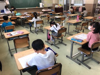 2年生の教室です。算数のクラスでは「たし算のきまり」を学んでいました。聴力検査があり、戻ってきた子どもたちはやり残しのプリントをそれぞれ仕上げます。