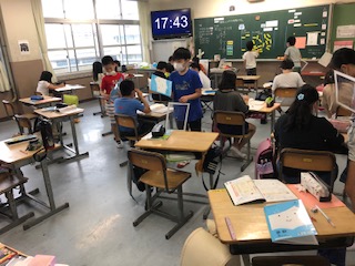 4年生は、社会のテスト「わたしたちのくらしとごみ」、環境問題が4年生のテーマとなり、さまざまな角度で考えていきます。算数の学び合いのクラスでは、先に終わった人が、フェイスシールドを持って、取り組んでいる人が困っているところがあれば支援します。