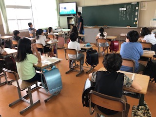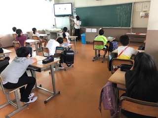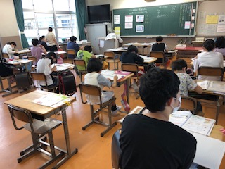 5年生の教室です。2クラスは、テレビで水泳の授業です。今年はプールを使っての授業ができないので、教室で理論を学びます。準備運動で気をつけること、クロールの動き方がわかりやすく映されています。1つのクラスでは、算数の授業、単位換算なのでなかなか難しい内容に取り組んでいます。