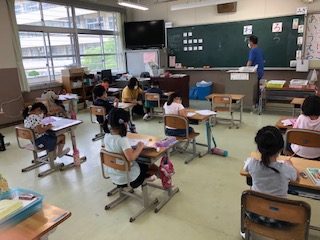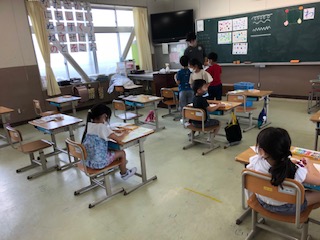 図工の時間で、クレヨンを太く使ったりしてデザイン画を描いているクラスと、ひらがな「ろ」「わ」を学習しているクラスです。