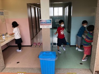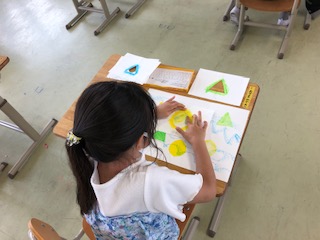 クレヨンで描いて手指で伸ばす工夫をしています。そして描き終わったら手を洗いに行きます。整然とした動きで落ち着いた1年の教室です。