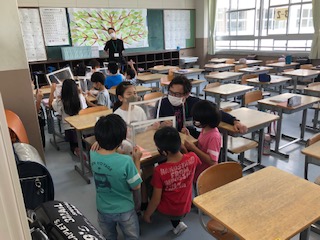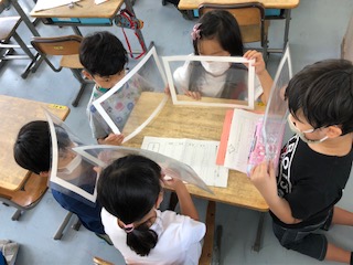 3年生です。この学級では、1人が作ったクイズを読み、みんなで考える活動です。全員がフェイスシールドをしているからこそ、できる活動です♪