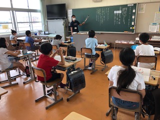 5年生の教室です。国語の説明文を学習しているクラスと、算数で「複雑なかたちの体積の説明」を学びあっていなるクラスです。