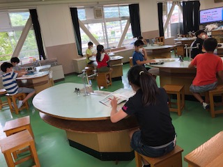1つのクラスは理科室でメダカについて学習していました。理科室には大きな水槽や小さな水槽、シャーレとあり、大きな水槽には大人のメダカが、少し小さな水槽には、卵をお腹に抱えた母メダカが、もっと小さな水槽には赤ちゃんメダカが、シャーレには生まれたばかりのメダカが分かれて住んでいます。写真は赤ちゃんメダカがたくさん元気に泳いでいる水槽、ちっちゃく白く光っています♪大人に食べられないように別にして、大きくなったら同じ水槽にします。