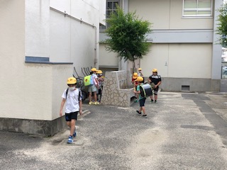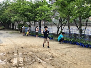 2年生は、登校の時に、ミニトマトの鉢に寄ってお世話をしています♪1年生は、1度教室へ上がって朝の準備をしてからアサガオの水やりに来ます♪