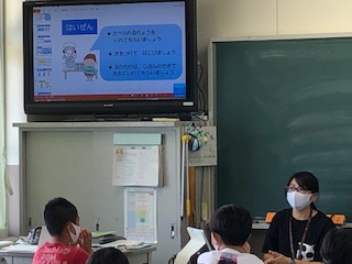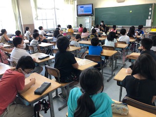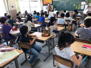 4年生は1クラスの人数が多く迫力がありますが、やはり6列で隣との距離を取っています。前後も先生机を隅に置いたり工夫して距離をとりました。今日から給食が始まるので配膳の説明やお代わりは先生がつぎにいきます。と説明があっていました。もう一つのクラスでは、プリントを配布しているところでした。
