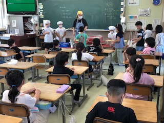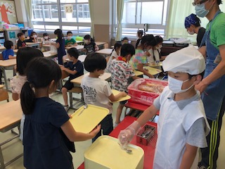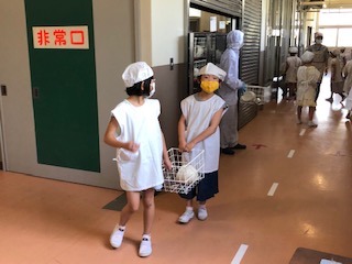 2年から6年は今日から給食です。低、中、高学年で時間をずらして取りに行きます。カフェテリア方式で、自分の給食を自分で取りに行きます。みんな席についた状態で端の人から距離を空けて並びます。スプーンやジャムを置く給食当番さんは、手袋をしています。大おかずは先生が注ぎます。
