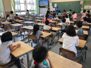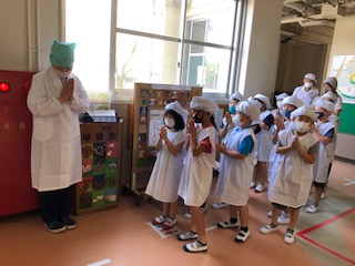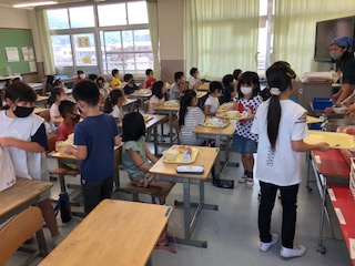 手を合わせて、「3年○組いただきます。」給食当番さんは声を揃えて挨拶します。教室では整然と準備が進んでいます。