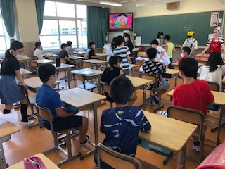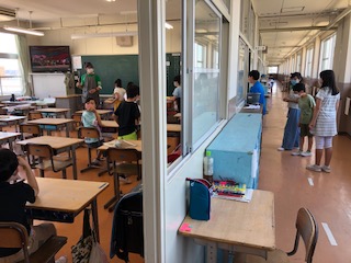 5年生は、静かでとてもスムーズに動いています。廊下でも距離を取って並んでいます。どの学年の教室でも、待ち時間は自席で過ごすので、アニメをながしています。