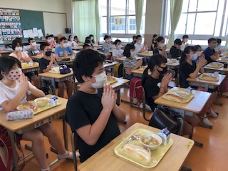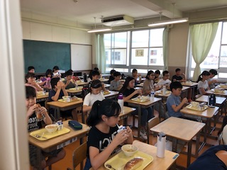 6年生は、2年が取りに行くより30分遅く給食を取りに行きました。どの教室もみんな席について、順番に自分の分をカフェテリアのように取って、座席に戻ります。アニメより、取りに行く順番に気が取られます。そして「いただきます」♪