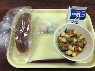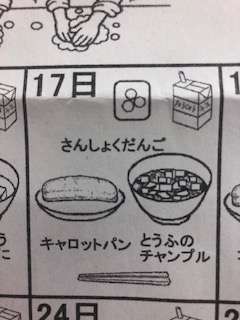 給食2日目です。コッペパンに見えますが、人参の朱色のパンでした。三色団子が嬉しい一品です♪