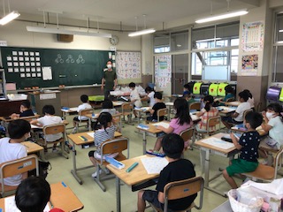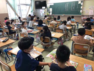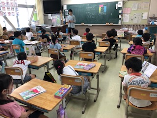 1年生のみんな揃っての授業、算数は数を二つに分けることを丁寧に取り組んでいます。国語「みんななかよし」は絵からもイメージが湧いてきます。名前の色塗りでは、全部色を変えてください、と指示がありました。