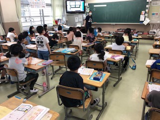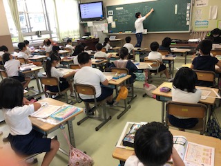 2年生の2クラスは、どちらも算数です。片方の教室では、ちょうど数を2つに分けて考えていました。1年生でやっていた、数を2つに分けることが、2年でもとても役に立つことがよくわかります。もう一つのクラスでは、解き方を1人の子が説明していました。答を言うだけではなく、説明することで、論理的な思考力につながります。