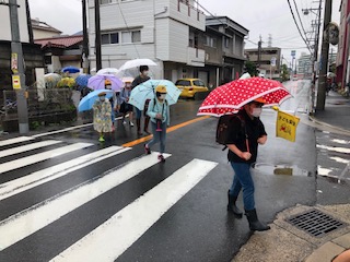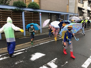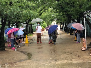 昨日からの雨量が心配されましたが、土砂災害までもなく、子どもたちの登校時分には、降り方も優しくなっていました。傘がある分、距離ができて、3密解消になります。「おはようございます」の挨拶があちらこちらから聞こえ、雨を吹き飛ばす爽やかさをもらいました♪