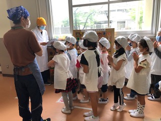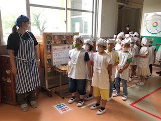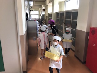2年生の給食運びです。この前まで1年生だつたのに、ずいぶんしっかりしました。今日のメニューは、かぼちゃのスープ、きっと大好きです♪