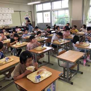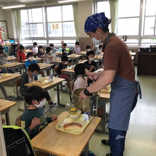 2年生の教室でも先生が注ぎ足しに回っていました。もうそろそろいただきますをします♪