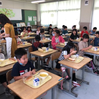 時間をずらして取りに行く3年生は、給食準備中です。早いクラスが美味しそうに味わっています。ここでも先生が注ぎ足しに回っています。