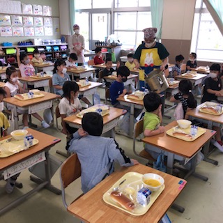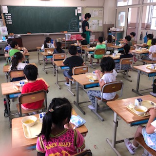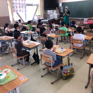1年生の準備が終わり、「手を合わせてください、いただきます。」までマスクをつけています。その後マスクを外し、2つに畳んで、トレイの下にはさみます。先生が増やしたい人の席を回って注ぎ足します。美味しいですね♪