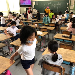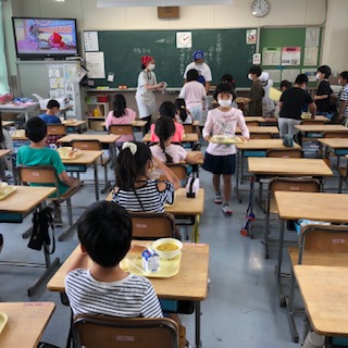 時間をずらして取りに行く3年生は、給食準備中です。早いクラスが美味しそうに味わっています。ここでも先生が注ぎ足しに回っています。