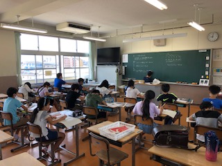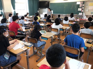 算数のクラスは少人数授業で、教室にいるのは半分、あと半分は少人数教室へ行って学んでいます。学級活動のクラスでは、クラス目標を子どもたちが主体的に考えるようなお話しでした。
