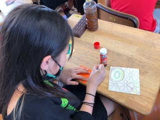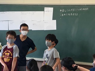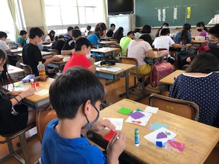 6年生です。クラス目標を子ども主体で話合いを進行して考えています。隣のクラスでは、図画工作のちぎり絵、それこそ細かく色紙をちぎって貼っている人もいます。楽しそうです♪