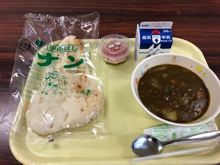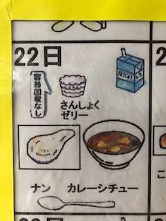 今日の給食は、子どもたちに1番人気のカレーシチュー、ナンがついています。三色ゼリーが特別感のあるデザートです♪
