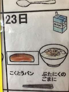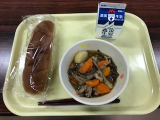今日の給食は、シンプルな和食です。美味しく味付けされていて、しっとり柔らかい黒糖パンと合いました。