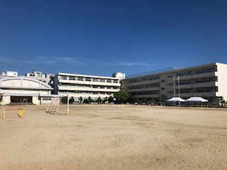 今日は、遠くに雲がたなびく柔らかい青空です。運動場には、体育の授業などで休憩したりするために、テントを張っています。対コロナ…むしろ熱中症予防です。1番早い登校班が来ました。信号には、見守り隊の方が立って子どもたちの安全を守ってくださっています。良い1日の始まりです。