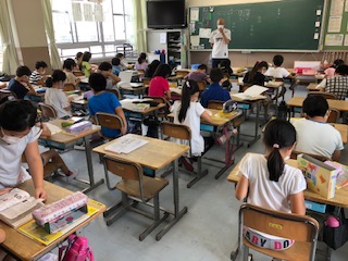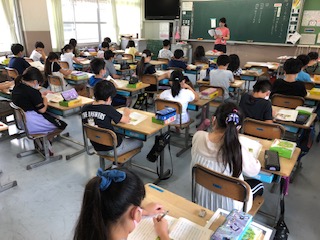 3年生の教室です。よく集中して取り組んでいます。国語で先生が読むのをしーんと聞いているクラス、言葉の辞書引きをしているクラス、道徳で先生の質問に発表する子の考えを静かに聞いているクラス、の様子です。