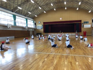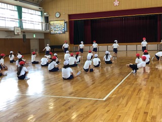 体育館の窓を開けて、6年の体育です。柔軟体操で、先生のお手本をマネする子どもたちが「いたた…。」なんと舞台の先生の方がとてもとても体が柔らかでした!その後はくっつかない運動で、舞台まで行きは「後ろ走り」帰りは「スキップ」の競争です。