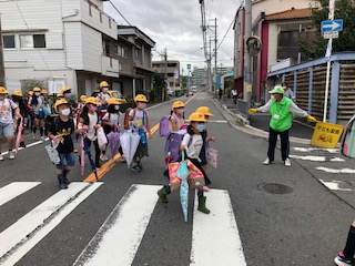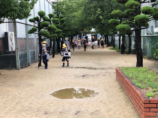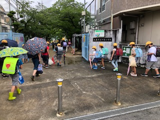 雨がパラつく月曜日の朝です。傘を手に、子どもたちが登校して来ました。