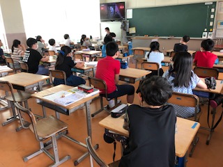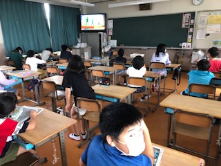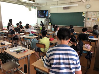 雨の20分休み、5年生ではそれぞれの教室で動画を流しています。ハリー・ポッターのクラスもあります。