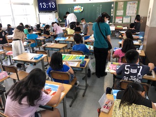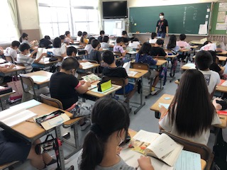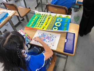 4年生の教室です。国語「一つの花」では、題名からどんなイメージか、物語への思いを膨らませます。図画工作「夢のお城」では、それぞれの思い描く城が色とりどりに描かれます。みんな西洋のお城のようです。