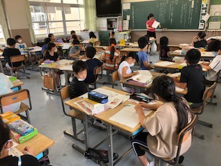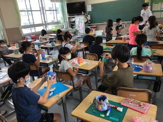 3年の教室です。図画工作では、紙粘土で自分のカップ作成♪形も色も飾りつけもカラフルに表現しています。国語「まいごのかぎ」では、段落を分けて丁寧に整理して読み取っています。