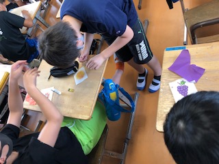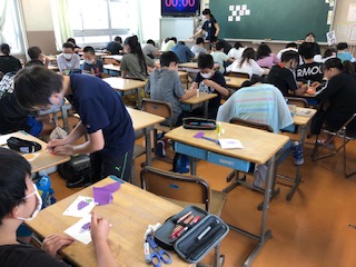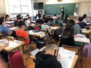 6年生の教室です。おや…担任の先生が反対の教室にいます。交換授業です。1組では2組の担任が図画工作でちぎり絵づくりです。2組では1組の担任が社会の授業をしています。とても落ち着いて集中しています。