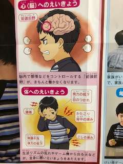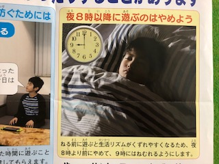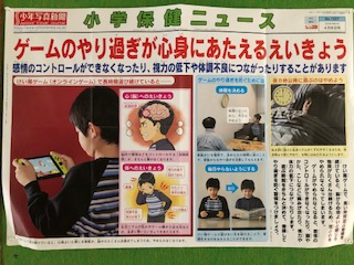 掲示板で見つけたポスターです。ゲームは楽しいけれど、心が乗っ取られやすいところが怖いですね。お家でもルールを決めてきちんと守って楽しむよう、お願いします。