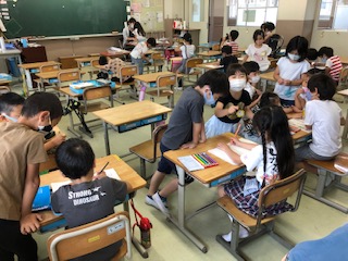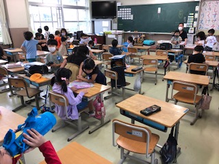 1年生の朝の教室です。ほぼみんな揃い、健康チェックも終わって、朝の準備をしたり、ゆったりとしたひとときです。
