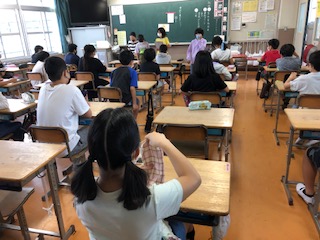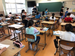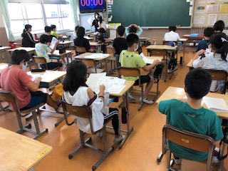 朝の5年の教室です。1時間目の算数は半分が少人数教室へ移動です。プリント配布のクラス、朝の会を児童の司会で行なっているクラスがありました♪