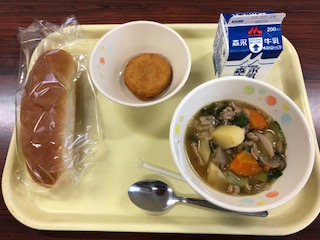 今日の給食です。きのこのバター煮は、とても美味しく、それでいて調味料の取り合せがどうなのか不思議な味付けでした。コーンは夏らしい一品です♪
